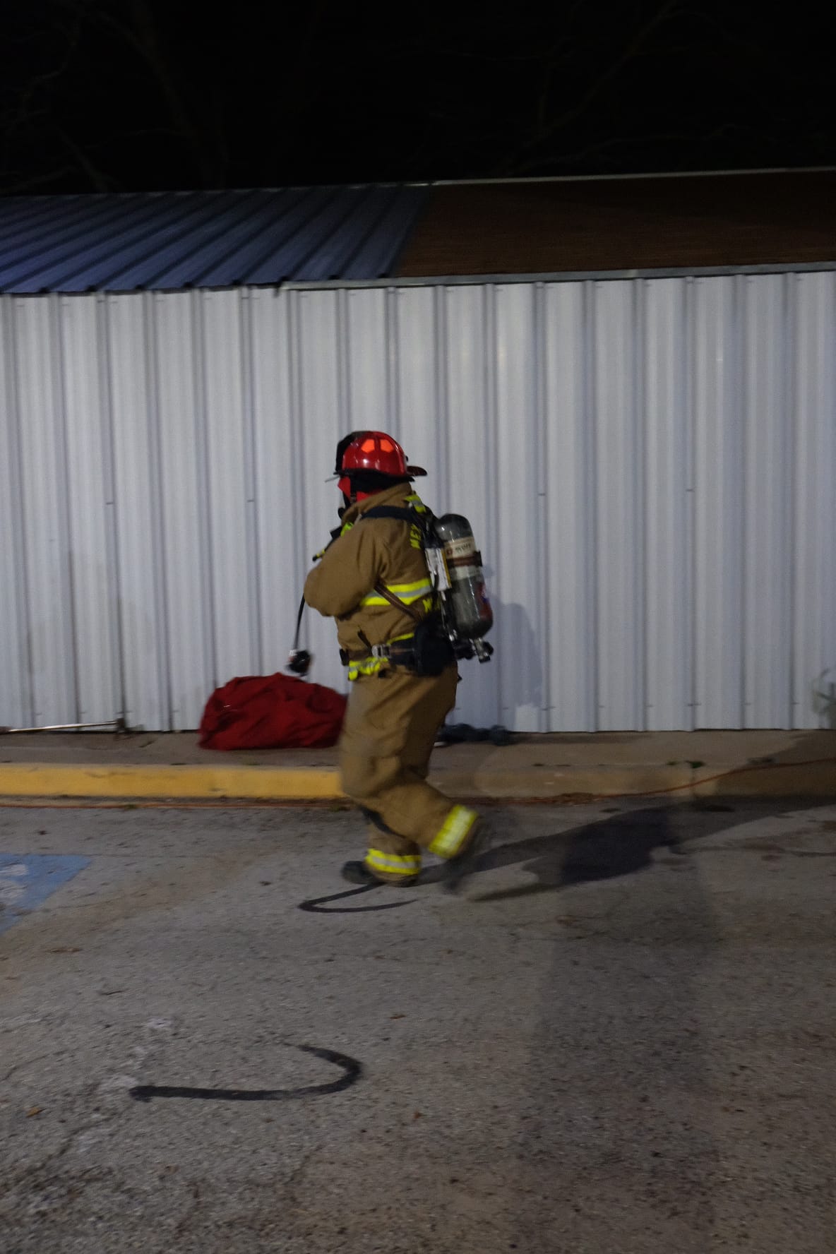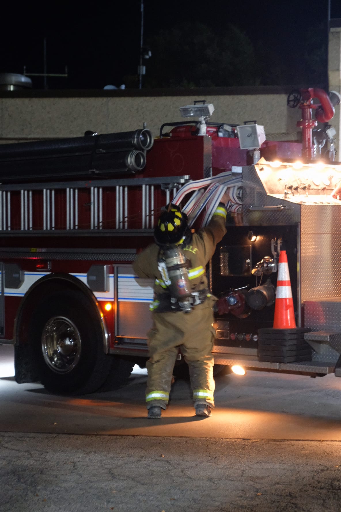 Firefighters in gear walk near a fire truck with hoses outside a building at night during an emergency response scene.